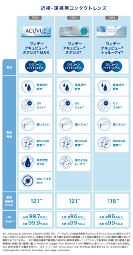(たとえば、同じメーカーの「アキュビューオアシス」シリーズでも、製品ごとにUVカット性能が少しずつ異なります。)