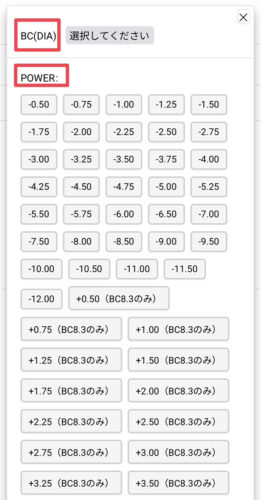 BC(ベースカーブ)や度数など、お使いのレンズ情報を入力してください。