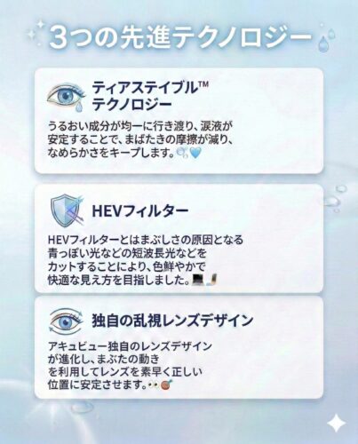 レンズ全体にうるおい成分が均一に行き渡り、涙の層が安定します。まばたきの摩擦が減り、一日中なめらかなつけ心地が続きます🤲🏻🩵